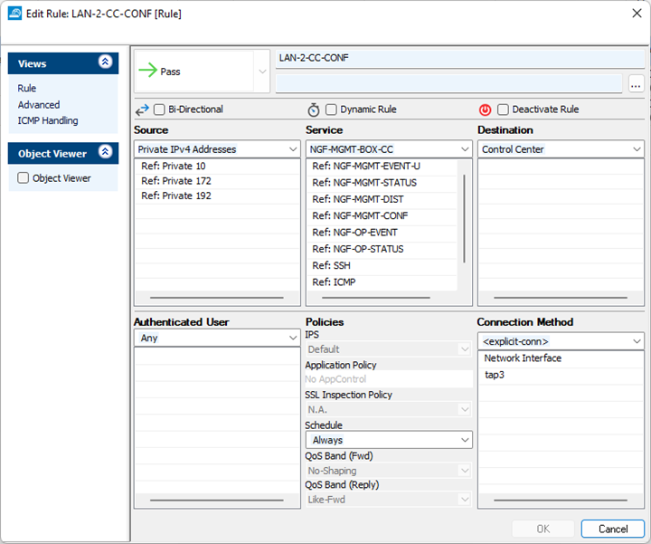 For this we will match the internal traffic: Private IPv4 addresses and the CC configuration services object. The destination will be the predefined “Control Center” object.